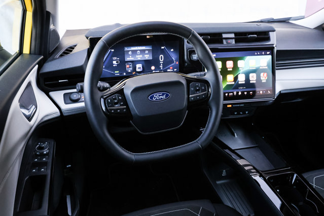 La interior, Puma Gen-E vine cu un display wide de 12,8 inchi pentru ceasurile de bord şi o tabletă de 12 inchi pentru sistemul de infotainment Sync 4, care controlează climatizarea, modurile de condus, inclusiv comenzile pentru scaune încălzite.