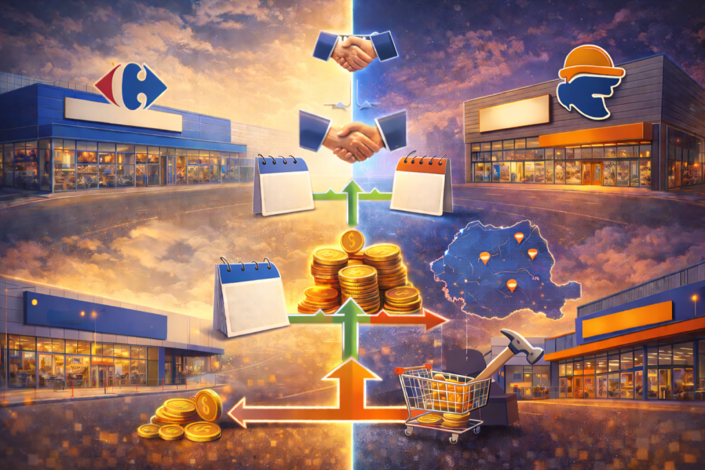 Carrefour deschide primul hipermarket în București în 2001 și accelerează expansiunea în 2008, când ajunge la 21 de magazine și pragul de 1 mld. € pe piața locală. Dedeman pornește în 1992 din Bacău, trece la bricolaj în 2002 și intră în București în 2009. În 2024, cele două ajung aproape la același nivel al cifrei de afaceri în România: 12,5 mld. lei la Carrefour și 12,3 mld. lei la Dedeman, conform ZF.