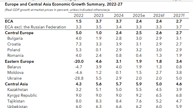România se situează sub media regiunii Europa Centrală, unde Banca Mondială estimează o creștere de 2,5% în 2025 și 2,7% în 2026. Cele mai mari ritmuri de creștere din regiune sunt așteptate în: