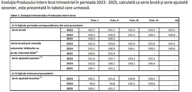 INS revizuiețte mai multe date ca urmare a revizuirii seriei brute prin includerea estimării Produsului intern brut pentru trimestrul II 2025 în seria trimestrială, seria ajustată sezonier a fost recalculată, iar indicii de volum sunt revizuiţi faţă de a doua variantă provizorie a Produsului intern brut pentru trimestrul I 2025, publicată în comunicatul de presă nr. 175 din 10 iulie 2025, astfel :