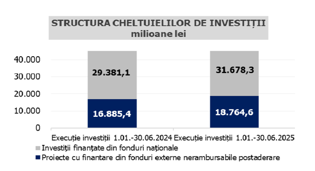 Cheltuielile pentru proiecte finanțate din fonduri externe nerambursabile cresc cu 22,19% și ajung la 29,91 miliarde lei. Cheltuielile pentru investiții, care includ atât cheltuielile de capital, cât și programele de dezvoltare finanțate intern și extern, sunt de 50,44 miliarde lei, în creștere cu 9,03% față de aceeași perioadă a anului precedent.