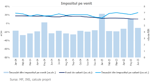 Încasările din impozitul pe salarii și venit totalizează 30,34 miliarde lei, în creștere cu 21,8%, influențate în special de avansul încasărilor din impozitul pe dividende (+84,8%) și eliminarea facilităților fiscale în anumite sectoare.