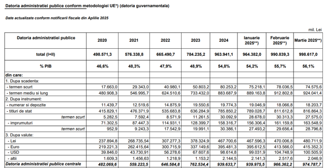 - Datoria publică a României ajunge la 998 miliarde lei, 56,1% din PIB în martie 2025, scrie ZF.