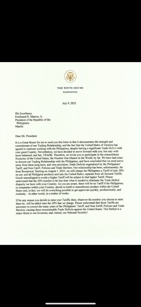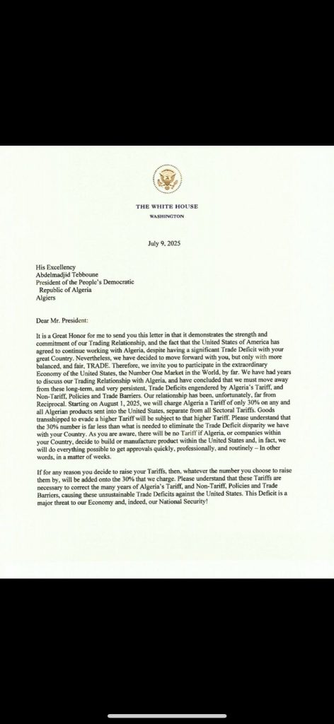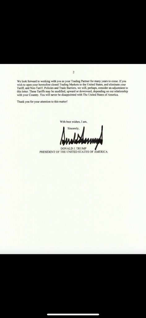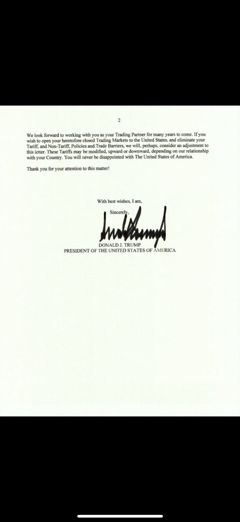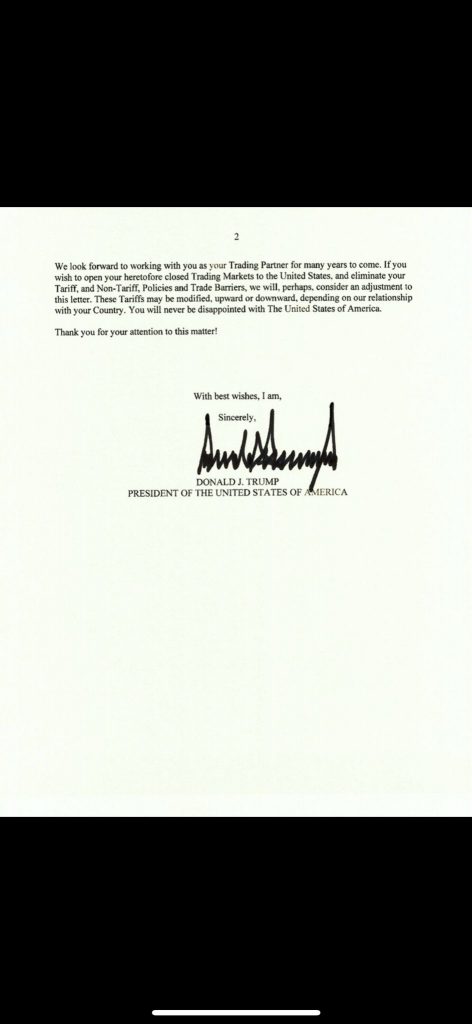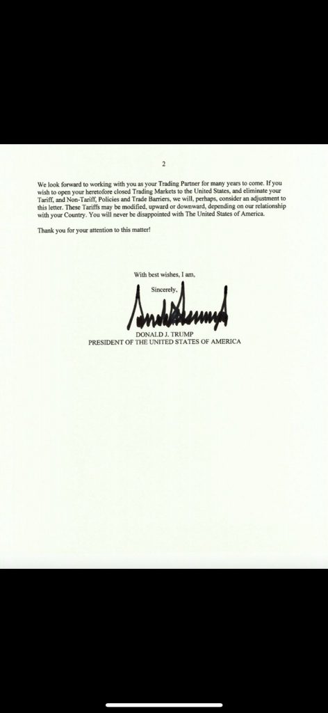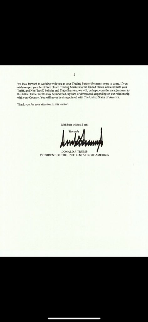 Donald Trump publică pe platforma Truth Social un set de scrisori adresate mai multor țări, în care anunță tarife comerciale propuse.