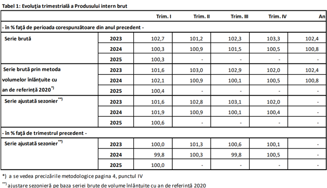 Comparativ cu trimestrul IV din 2024, PIB-ul rămâne constant în primele trei luni ale anului 2025.
