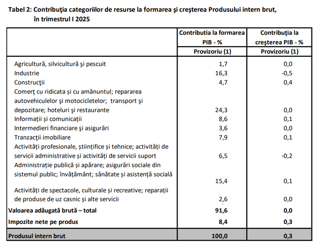 - Economia României crește cu 0,3% în T1/2025, susținută de construcții și servicii, industria scade, scrie ZF.