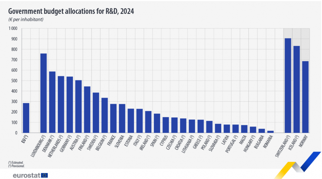 La nivelul Uniunii Europene, alocările pentru cercetare-dezvoltare au o medie de 284 euro de persoană în 2024, ceea ce reprezintă o creștere semnificativă de 57% față de 2014, când valoarea era de 181 euro. Această creștere reflectă o tendință generală în rândul țărilor europene de a investi mai mult în domeniul cercetării și dezvoltării.