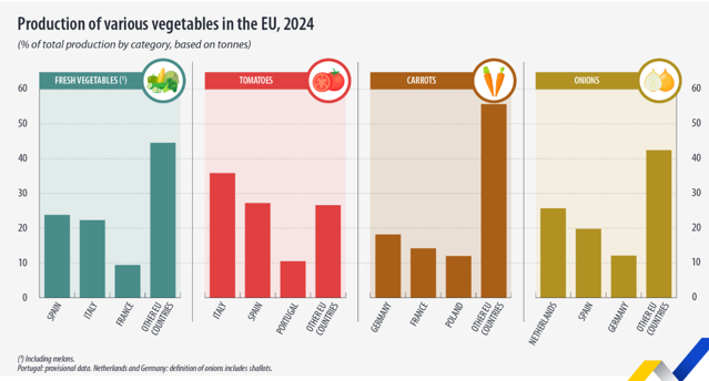 România se situează pe locul 9 în UE pentru producția de roșii, cu peste 231.000 tone. Morcovii provin în special din Germania, Franța și Polonia, în timp ce Olanda rămâne principalul producător de ceapă, cu un sfert din producția UE, urmată de Spania și Germania.