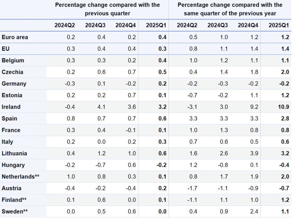 - În primul trimestru din 2025, PIB-ul crește cu 0,4% în zona euro și cu 0,3% în UE față de trimestrul anterior, potrivit Eurostat.