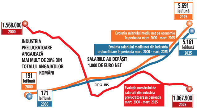 În martie 2025, salariul mediu net în industria prelucrătoare depășește pentru prima dată pragul de 1.000 de euro (echivalentul a 5.161 lei lunar). Acest moment devine o dovadă a maturizării acestui sector-cheie pentru economia românească, care pornește în anul 2000 de la un salariu mediu de doar 177 de lei, adică mai puțin de 20 de euro la acel moment. Creșterea ajunge astfel la aproape 30 de ori în 26 de ani.
