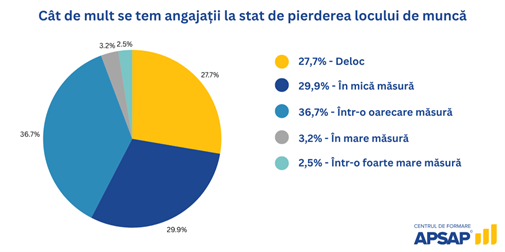 Doar 5,7% declară că se tem în mare sau foarte mare măsură de o posibilă concediere, în timp ce restul fie nu au deloc temeri, fie le au într-o mică măsură.
