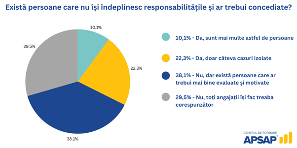 Deși în instituțiile publice există persoane care nu își îndeplinesc responsabilitățile, angajații preferă soluții „soft”, precum evaluarea și motivarea acestora, decât concedierea. Doar 10% consideră că există mai multe persoane care ar trebui date afară, iar aproape 30% spun că toți își fac treaba corespunzător.
