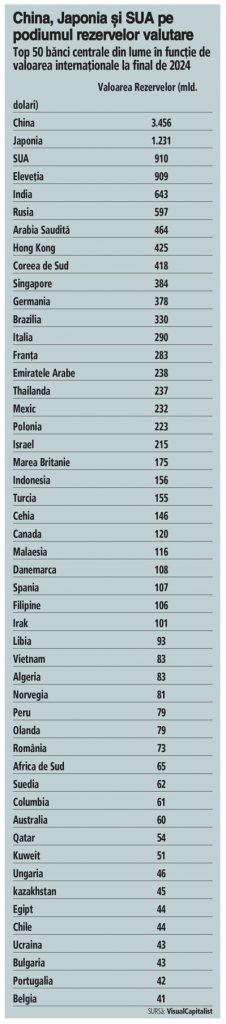 Conform datelor Visual Capitalist, China deține cele mai mari rezerve internaționale din lume, cu aproximativ 3.500 mld. $. Japonia ocupă locul doi, cu 1.231 mld. $, urmată de SUA, cu peste 910 mld. $. România, cu cele 73 mld. $, urcă în top și depășește țări care istoric aveau rezerve mai mari.