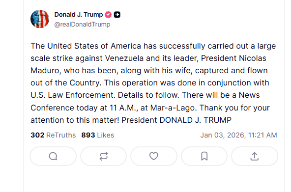 „Statele Unite ale Americii au desfășurat cu succes o operațiune de amploare împotriva Venezuelei și a liderului său, președintele Nicolas Maduro, care a fost capturat împreună cu soția sa și transportat cu avionul în afara țării. Această operațiune a fost realizată în colaborare cu forțele de ordine americane. Detalii vor urma. Astăzi, la ora 11:00, va avea loc o conferință de presă la Mar-a-Lago. Vă mulțumim pentru atenția acordată acestei chestiuni! Președintele DONALD J. TRUMP”, a scris Trump pe Truth Social.