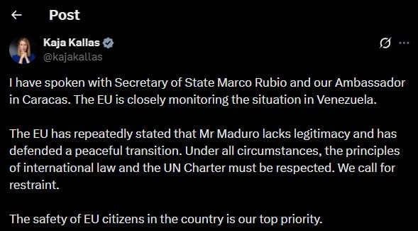 Kaja Kallas, reprezentantă a UE: „Am vorbit cu secretarul de stat Marco Rubio și cu ambasadorul nostru la Caracas. UE monitorizează îndeaproape situația din Venezuela.
