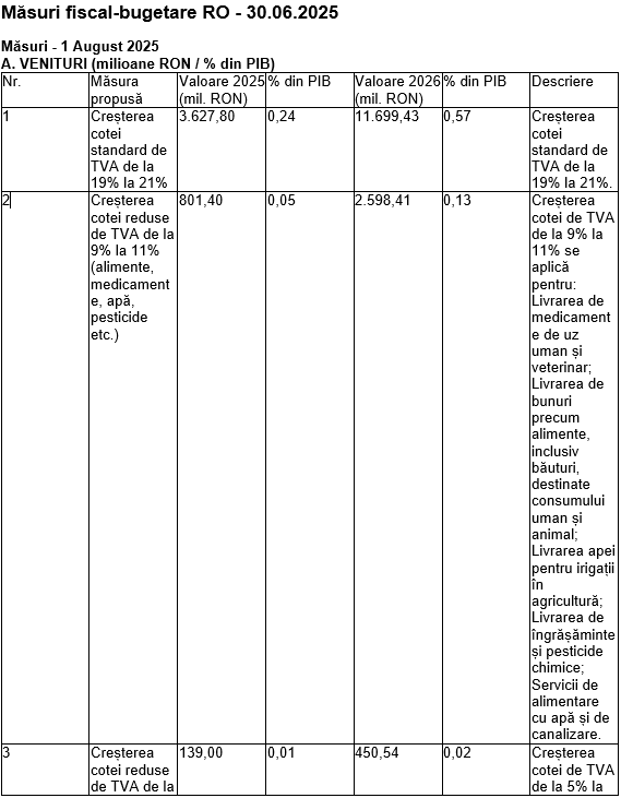 Aleph Business are documentul măsurilor discutate de România cu Comisia Europeană: TVA de 21% de la 1 august și o singură cotă redusă, de 11%. Și majorarea impozitului pe cifra de afaceri în sectorul bancar de la 2% la 4%, printre altele.