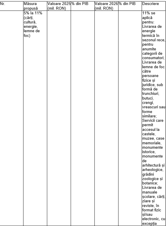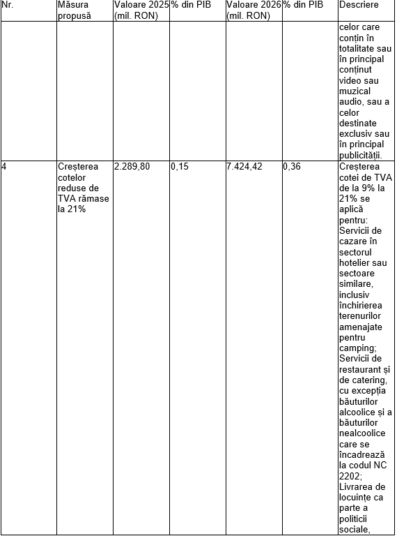 Impactul total combinat al majorărilor de taxe și reducerilor de cheltuieli este de 23,36 miliarde lei (1,2% din PIB) în 2025 și 76,23 miliarde lei (3,75% din PIB) în 2026. Decizia finală este încă în curs.