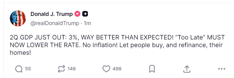 Economia SUA crește cu 3% în al doilea trimestru, conform raportului Departamentului Comerțului. Această creștere depășește estimările analiștilor, care prognozau o creștere de 2,3%. În primul trimestru, PIB-ul scade cu 0,5%, din cauza unei scăderi semnificative a importurilor și a unei cheltuieli de consum mai slabe, legate de incertitudinile tarifare, scrie WSJ.