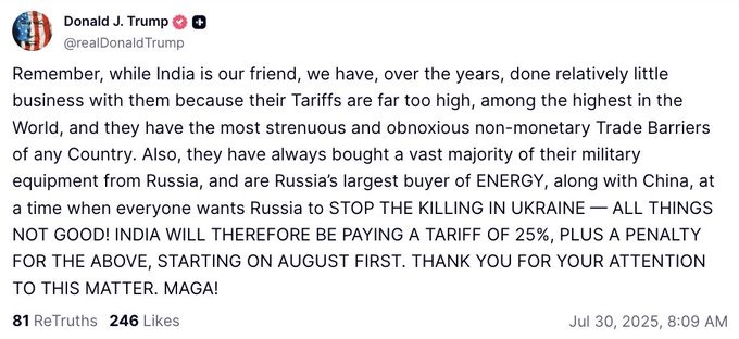 Președintele Donald Trump anunță pe Truth Social. că va impune o rată a tarifelor de 25% Indiei din 1 august. El sugerează că va introduce o sancțiune suplimentară pentru achizițiile de energie ale Indiei din Rusia.