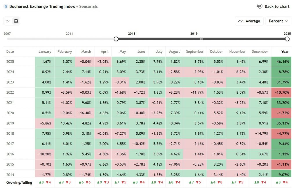 După un început de an marcat de tensiuni politice și o corecție modestă în primăvară, piața intră într-un trend ascendent susținut, cu serii lungi de luni pozitive și corecții minore, rapid absorbite. Bursa de Valori București devine mai mare, mai diversificată și mai bine ancorată în fluxurile de capital instituțional. Prezența fondurilor de pensii, ponderea ridicată a companiilor cu politici consistente de dividende și intrarea unui număr tot mai mare de investitori de retail contribuie la stabilizarea trendului și la menținerea unui apetit constant pentru risc. Randamentul anual de aproximativ 54% cu tot cu dividende se realizează într-un mod „liniar”, fără episoade majore de panică sau corecții bruşte, o structură mai degrabă specifică piețelor dezvoltate aflate în faze mature de bull market decât unei burse emergente.
