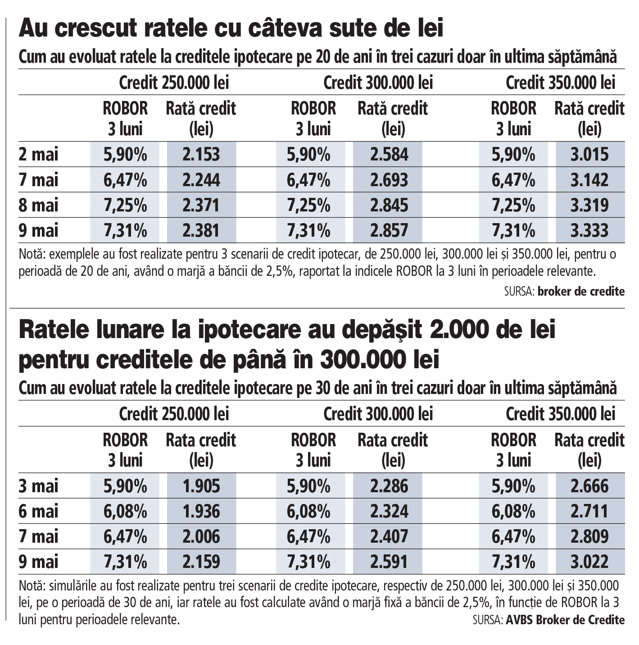 Aceste majorări au loc în contextul unei creșteri a indicelui ROBOR la 3 luni, care urcă de la 5,90% pe 2 mai la 7,31% pe 9 mai, ceea ce reprezintă o creștere de 23%, scrie ZF.