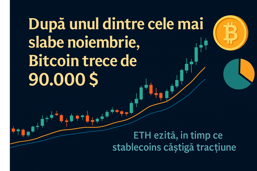 Bitcoin stabilizează după corecția din noiembrie și recuperează din zona 80.000 $ spre 90.000 $ până pe 27 noiembrie. Ethereum are un rebound modest din zona 2.7k spre 3k, dar rămâne sub mediile cheie. Stablecoin-urile marchează prima scădere lunară în peste doi ani, pe fondul rotației spre risc mai mic, conform BingX.