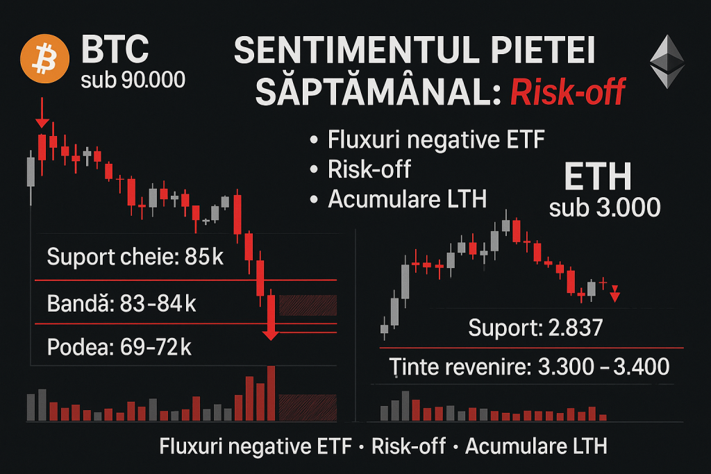 Ieșirile din ETF-uri, participarea instituțională modestă și schimbarea globală spre risk-off apasă pe preț. Pe on-chain, deținătorii pe termen lung și retailul acumulează, iar „whales” pe termen scurt redevin cumpărători. Zonele cheie: 83–84 mii $ ca suport imediat, respectiv 69–72 mii $ ca podea adâncă dacă presiunea de vânzare se accelerează; 85.000 $ rămâne nivel de urmărit.