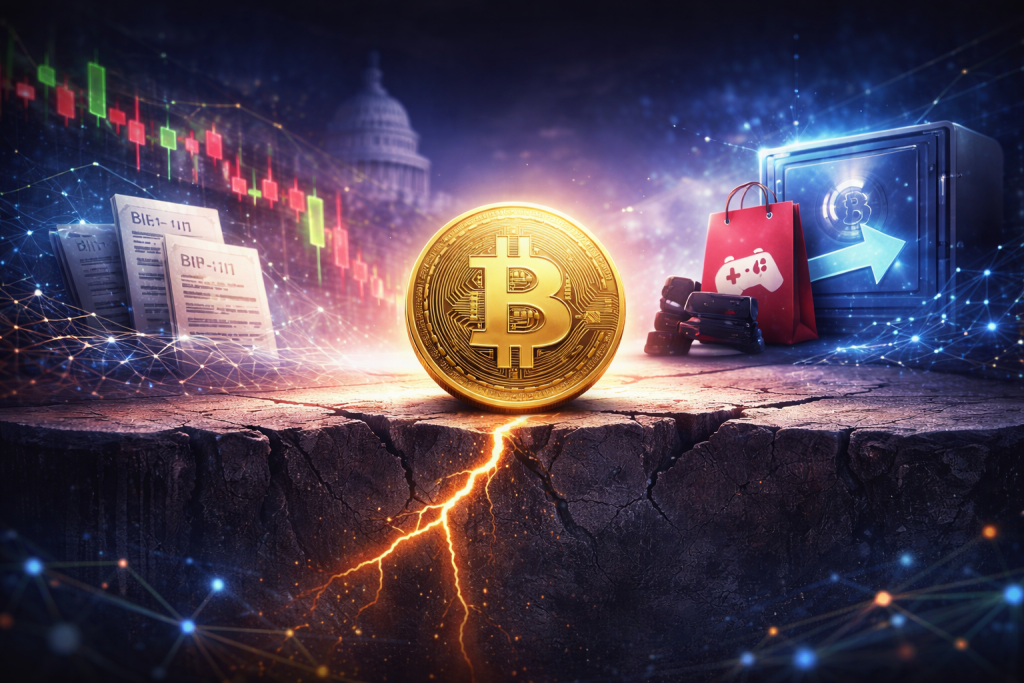 Bitcoin tranzacționează în jur de 88.700 $, după reculul de la 97.300 $ și intră într-o zonă decisivă de suport. În paralel, adopția BIP-110 urcă la 2,38% din noduri, iar GameStop își mută deținerile de Bitcoin către Coinbase Prime. Piața rămâne concentrată pe nivelul 88.000 $, ca prag care poate decide următoarea mișcare.